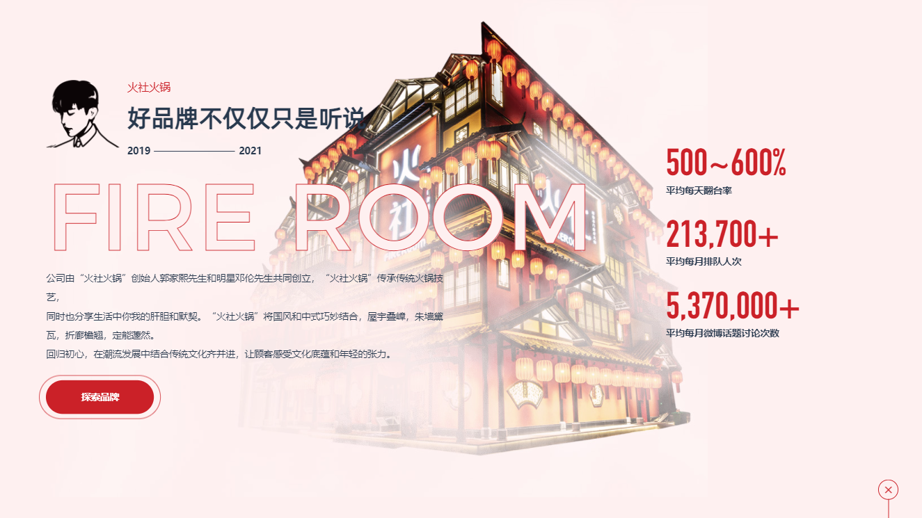 許多想要加盟火社品牌的加盟商往往會(huì)比較重視一個(gè)品牌的運(yùn)營(yíng)、盈利能力,而人們對(duì)于數(shù)字的敏感度遠(yuǎn)高于其他文字,所以在本次網(wǎng)站建設(shè)的時(shí)候,我們特意把火社品牌的每天翻臺(tái)率、每月排隊(duì)人次、微博話題討論次數(shù)數(shù)據(jù)展示出來(lái),體現(xiàn)品牌的可持續(xù)能力。